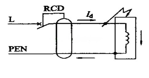 (3)不能使用RCD(漏電保護器)。在TN-C系統中,N線和PE線合并成了一根PEN線,如果PEN線和相線都穿過RCD,如下圖所示。當發生相線碰設備金屬外殼時,相線和PEN線的故障電流在電流互感器中感應的電磁場互相抵消,RCD檢測不到故障電流而不動作,diangon.com從而造成了RCD拒動。此時人體接觸到金屬外殼,加在人體上電壓為220V,人體的電阻一般為1000歐姆到2000歐姆之間,人一旦接觸到220V電壓時,通過人體的電流大概為110mA到220mA,此時相線和PEN線中通過電流不一樣,足夠使30mA的RCD動作,但是人體要觸電后RCD才能跳閘。這種一種不規范的做法,只能保證基本安全。為了解決上述問題,在RCD前將PEN線分為PE線和N線,將N線和相線穿入RCD中,PE線直接連接到外露可導電的設備外殼上,此時將TN-C系統改造成了局部的TN-C-S系統。電工學習網